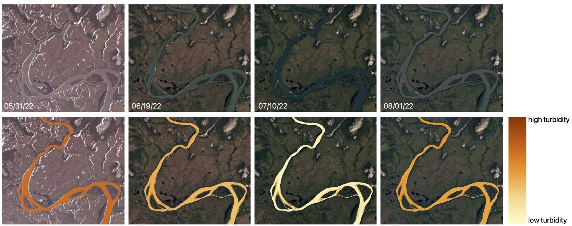 Arctic rivers are severely underobserved compared to lower latitude systems, but they exert considerable control on coastal ecosystems and the Arctic Ocean. Lack of observations for Arctic river discharge and sediment transport limits our ability to understand how these systems may change with continued warming. We are working on the ungaged Noatak River in Alaska to quantify seasonality in river discharge, turbidity, and sediment transport and to understand how the relationships between discharge and sediment flux change on monthly and seasonal timescales. Xiwei Guo is comparing field-measured turbidity to various metrics of turbidity from remote sensing to understand how we can better measure river turbidity and suspended sediment concentration with limited field measurements.